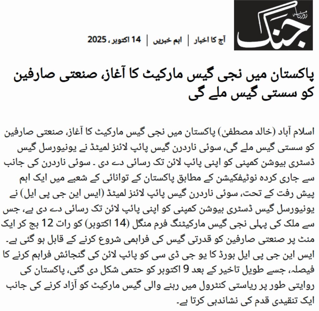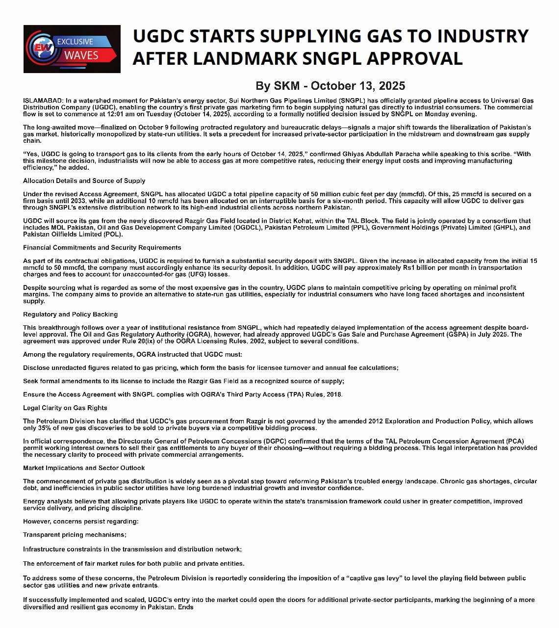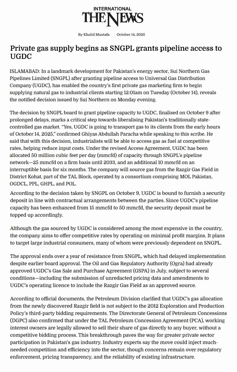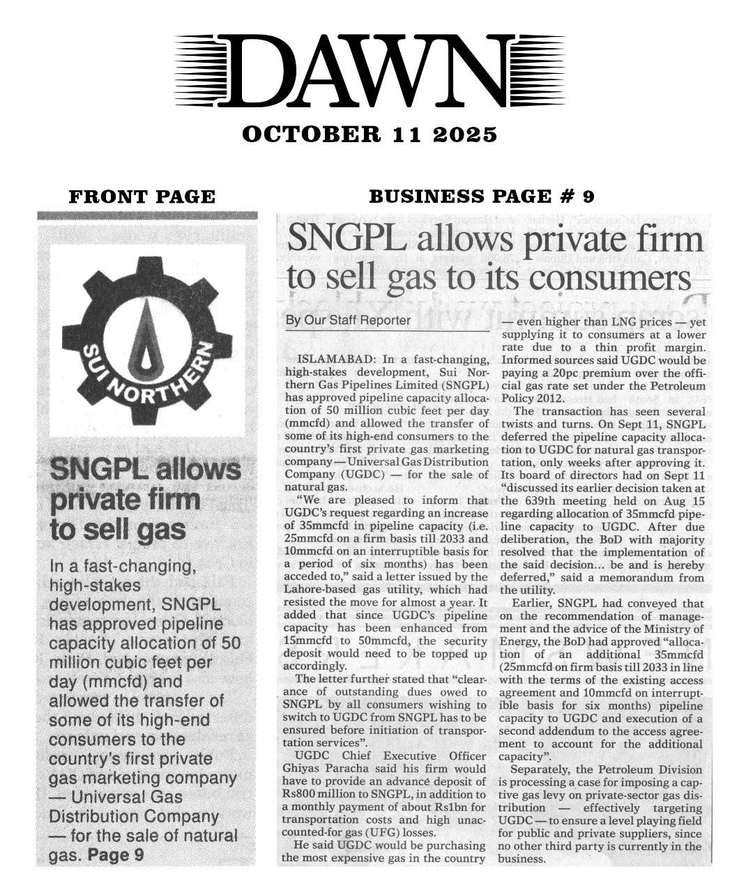 Universal Gas Distribution Company (UGDC) has achieved a landmark milestone with approval of 50 MMCFD of Natural Gas Supply Capacity to industrial consumers through SNGPL’s existing pipeline network. This marks a historic step in Pakistan’s journey towards a more open and competitive energy market, as UGDC becomes the first private Natural Gas Distribution Company to operate through the state-owned transmission and distribution network system.